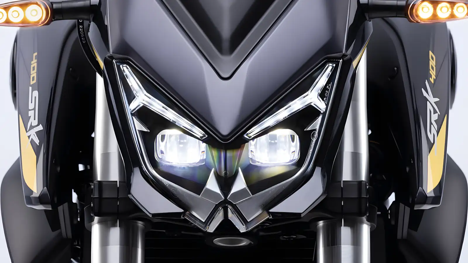 O visual da SRK 400 segue a linha streetfighter, com linhas angulosas e postura agressiva. Dessa forma, a moto “passa” sensação de porte maior, mesmo tendo proporções contidas. Em relação à iluminação, a naked utiliza sistema full-LED em farol, lanternas e piscas, assegurando visibilidade e durabilidade.