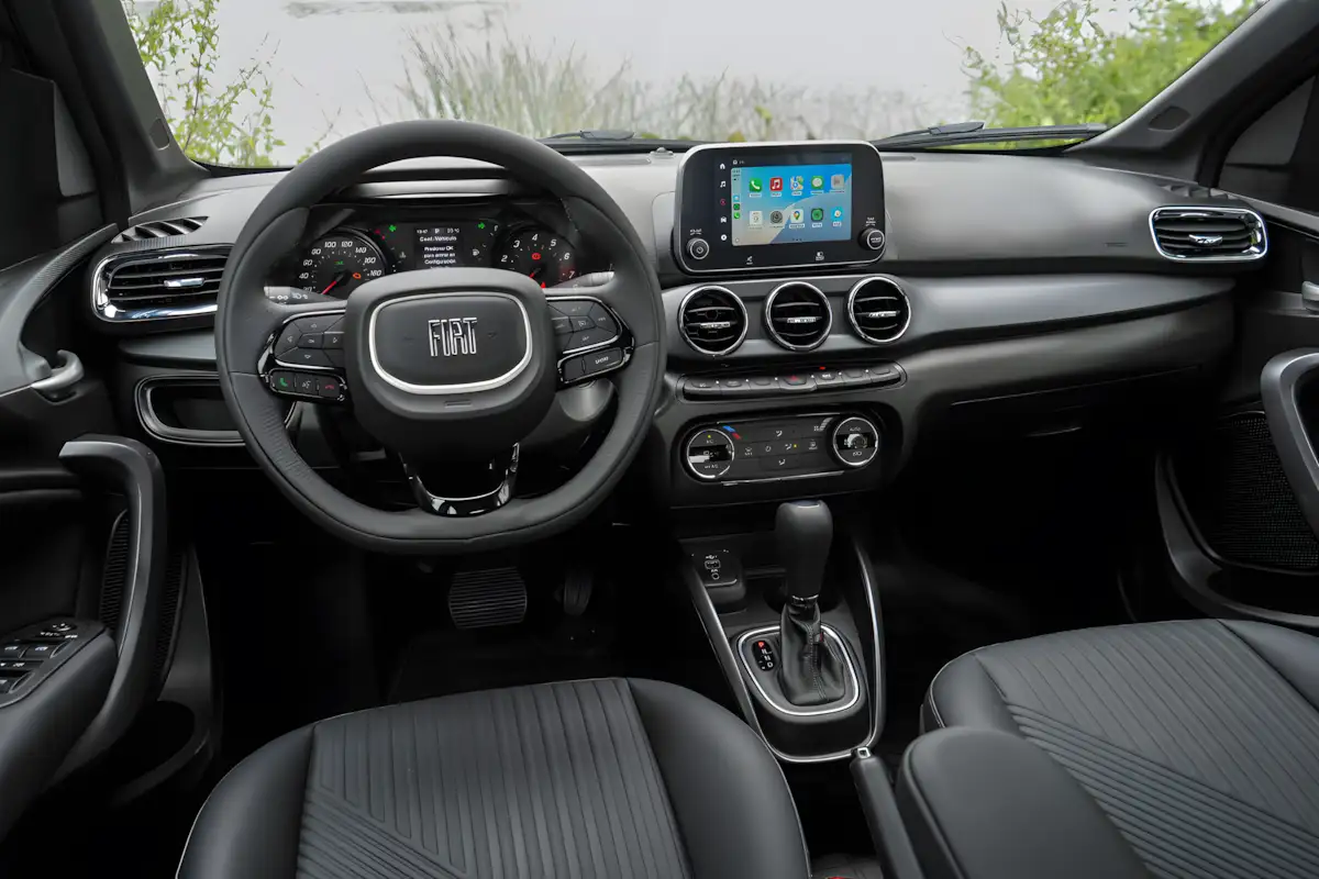 O interior do Cronos Precision 2026 traz bancos em couro preto de série, com opção de couro marrom por R$ 2.500 adicionais. A central multimídia Uconnect de 7 polegadas agora suporta Android Auto e Apple CarPlay sem fio com comandos de voz e duas portas USB (uma traseira). O painel analógico com velocímetro, conta-giros e computador de bordo mantém a praticidade.