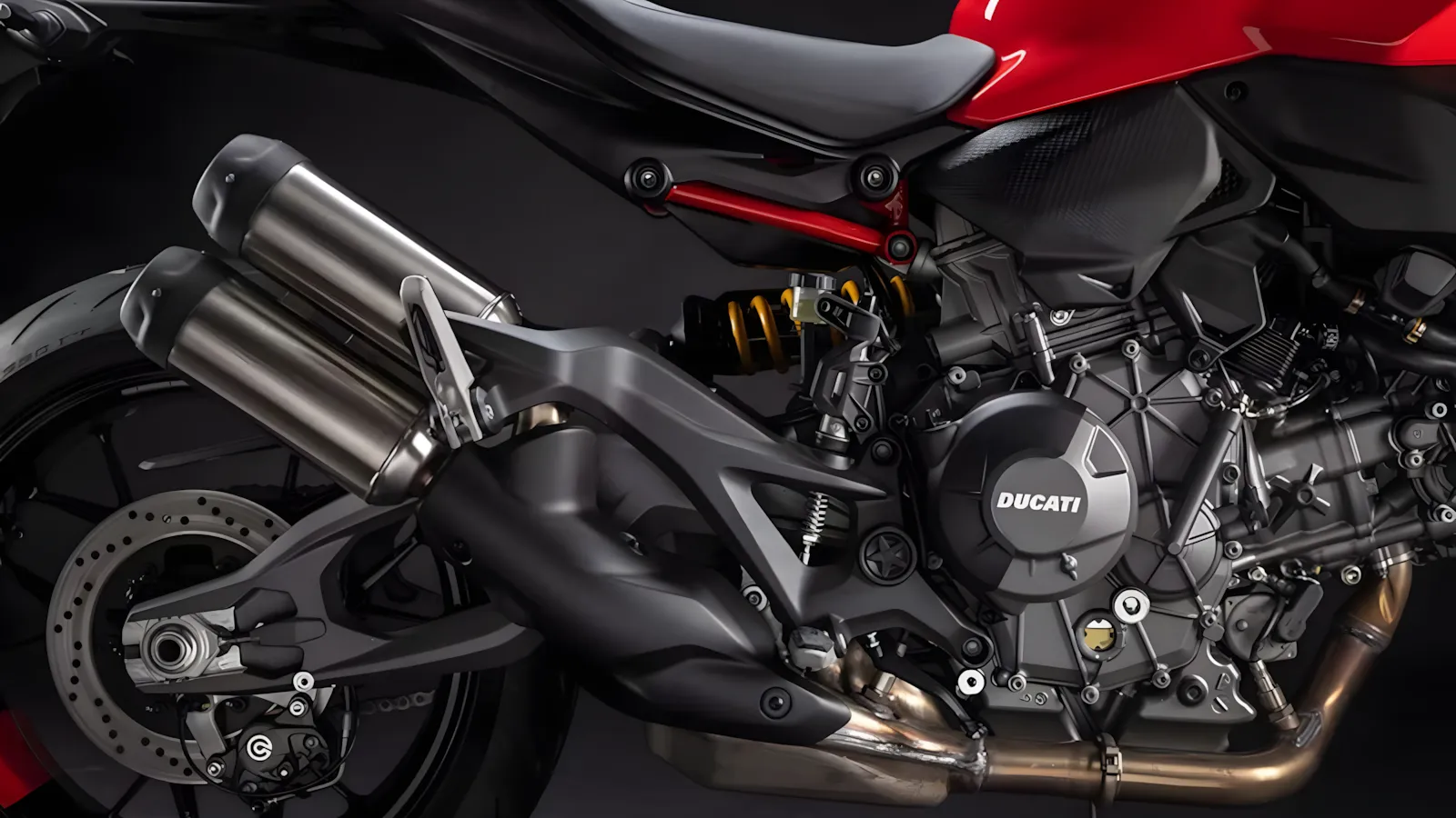 A Monster 2026 abandona o tradicional quadro em treliça. Agora passa a utilizar um chassi monocoque de alumínio inspirado nas superesportivas da marca. Essa mudança ajudou a baixar o peso seco total para 175 kg.