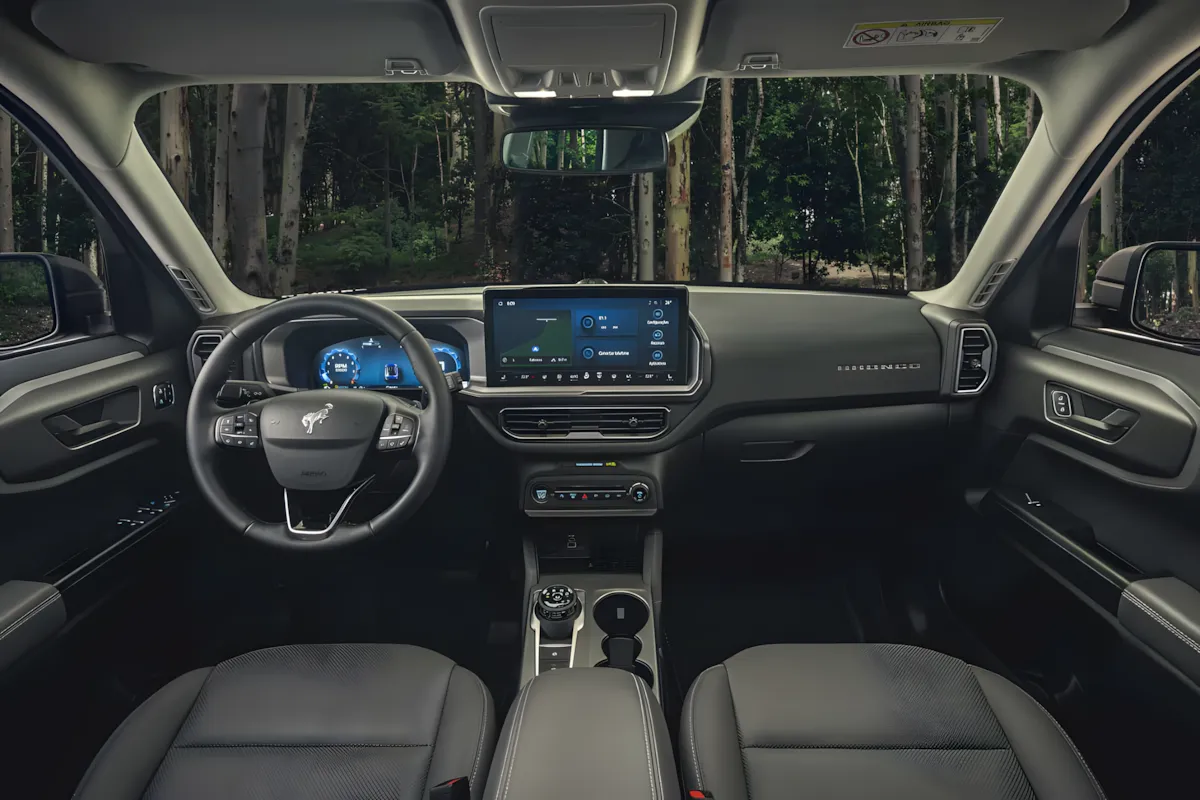 Por dentro, o Ford Bronco Sport Badlands recebeu boas melhorias. O destaque vai para a nova central multimídia SYNC 4 com tela de 13,2 polegadas. Ela tem conexão sem fio para Android Auto e Apple CarPlay, além de GPS integrado. Junto a ela, o painel digital agora é de 12,3 polegadas e pode ser atualizado remotamente (Over The Air).