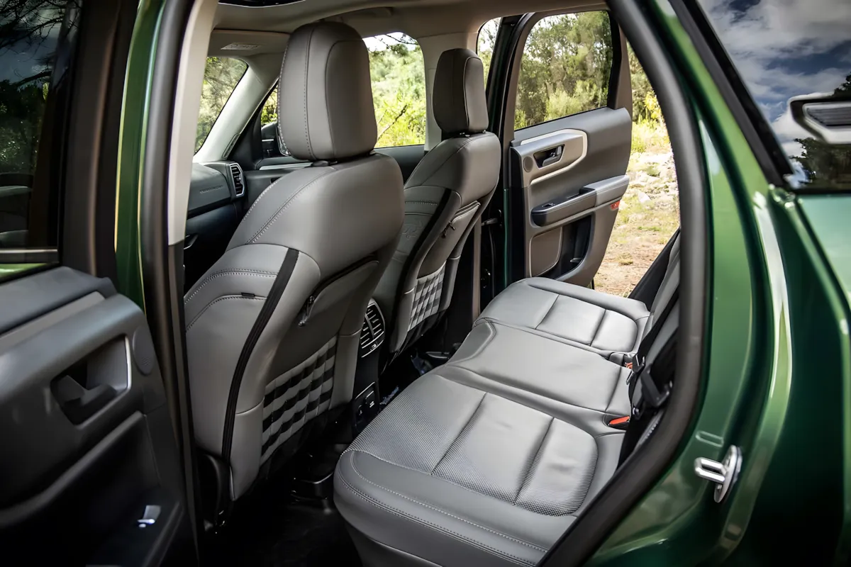 O Bronco Sport Badlands 2025 acomoda bem os ocupantes dianteiros. Os bancos têm bom apoio para as pernas e corpo. Atrás, o espaço é razoável para dois adultos. O assento central traseiro tem menos conforto, devido ao túnel e formato do encosto.