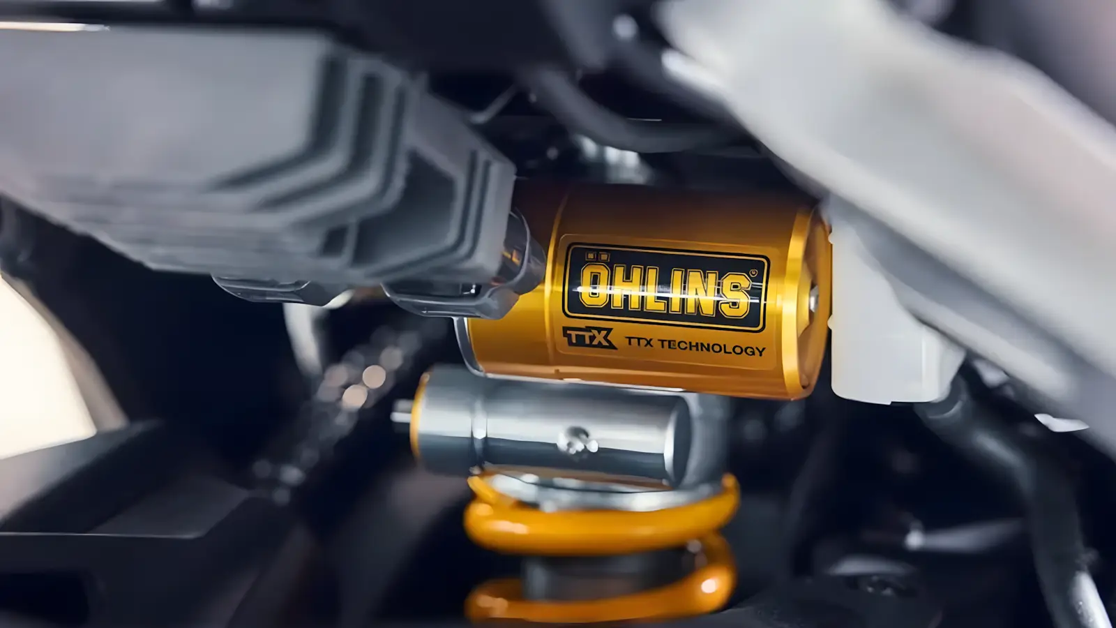 A suspensão traseira é fornecida pela Öhlins. O modelo TTX36 tem ajustes de compressão e retorno. Na dianteira, a moto usa garfos Showa SFF-BP de 41 mm invertidos com acabamento dourado.