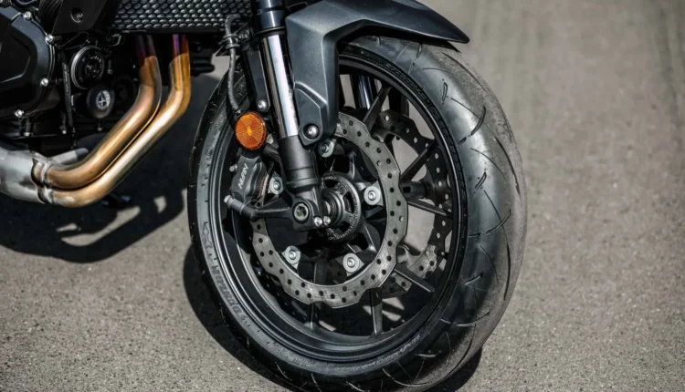 Os freios dianteiros têm dois discos de 296 mm com pinças Nissin radiais de quatro pistões. Na traseira o disco único mede 240 mm. O sistema ABS de dois canais vem de série nas duas rodas.