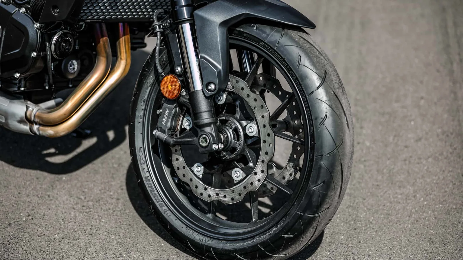 Os freios dianteiros têm dois discos de 296 mm com pinças Nissin radiais de quatro pistões. Na traseira o disco único mede 240 mm. O sistema ABS de dois canais vem de série nas duas rodas.