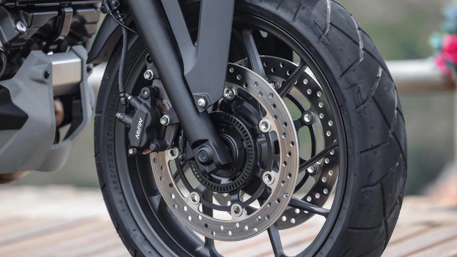 A grande alteração é no sistema de ͏freios dianteiros, agora a NC 750X 2026 usa dois discos de 296 m͏m ͏na frente. Esse conjunto substitui o disco único da geração anterior e tem ABS com dois canais, porém o freio traseiro mantém um único disco simples de ͏240 mm.