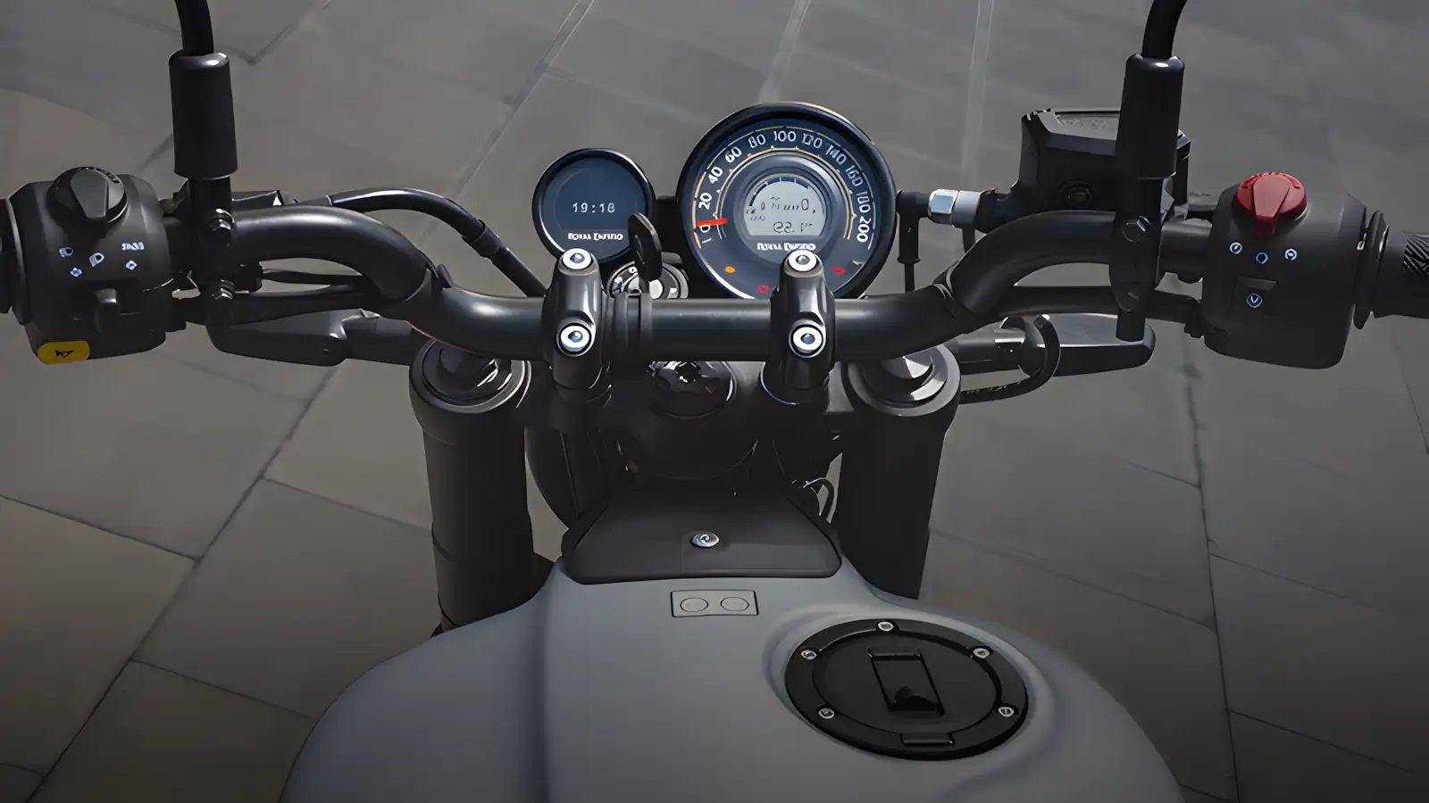 A Guerrilla 450 mantém o chassi e a base mecânica da Himalayan, mas ganhou linhas mais limpas e leves. Foi removido o para-brisa e as armações laterais, realçando o perfil street. Além disso, o tanque de 11 litros foi mantido, equilibrando estilo e autonomia.