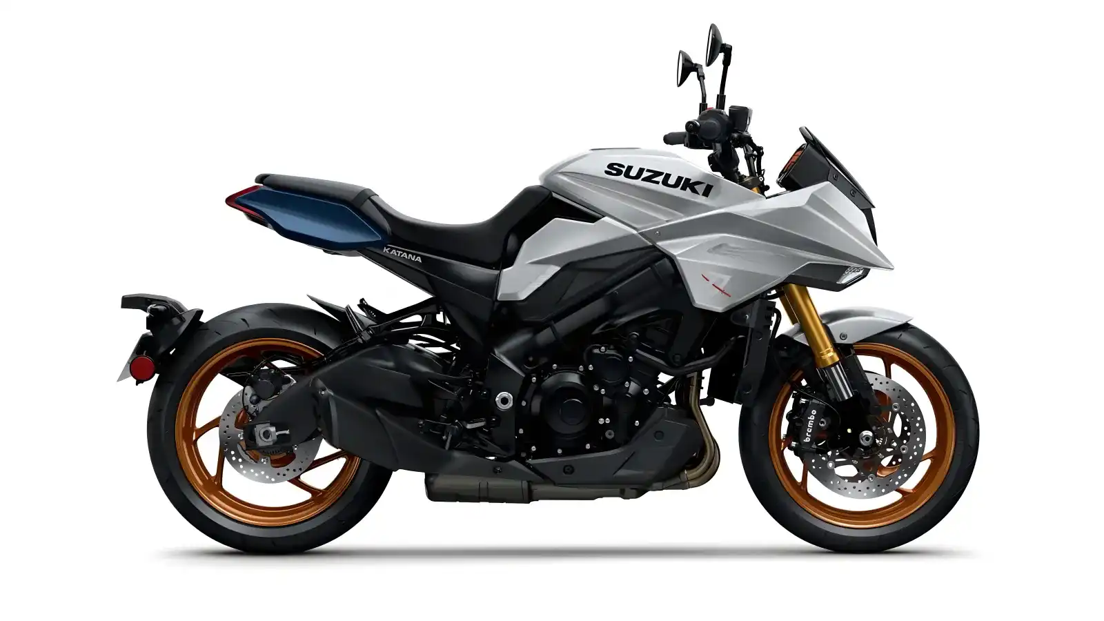 O modelo traz uma nova cor chamada Pearl Vigor Blue, que se junta à clássica Metallic Mystic Silver, oferecendo mais opções aos compradores. O estilo angular e robusto da Katana continua sendo seu principal destaque visual, preservando o respeito pela versão original dos anos 80.