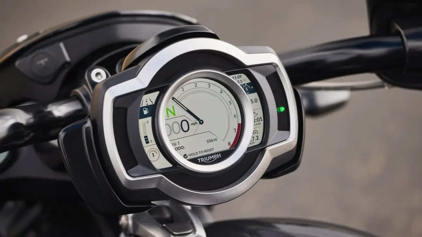 O painel de instrumentos é um display TFT multifuncional, que apresenta informações essenciais, como velocidade, nível de combustível, modos de condução (Rain, Road, Sport e Rider) e mais. Além disso, o sistema de conectividade TFT permite adicionar um módulo Bluetooth, integrando navegação e controle de mídia ao painel da motocicleta.